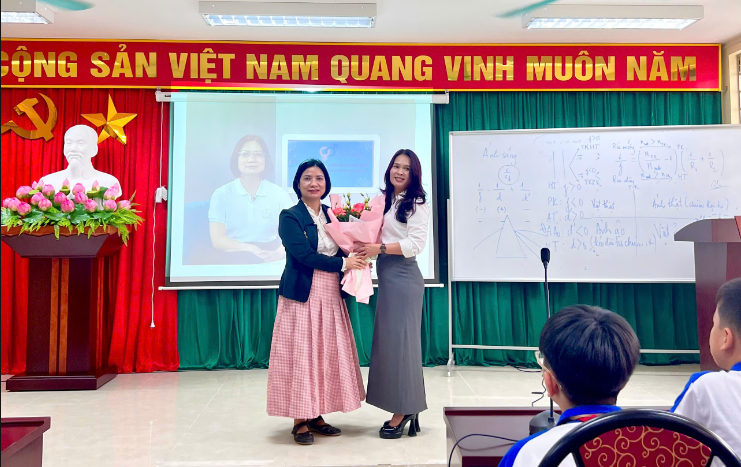 Cô giáo Nguyễn Thúy Vinh phó hiệu trưởng nhà trường lên cảm ơn và tặng hoa Bác sĩ CKII, ThS. Phạm Thị Vạn Xuân.
