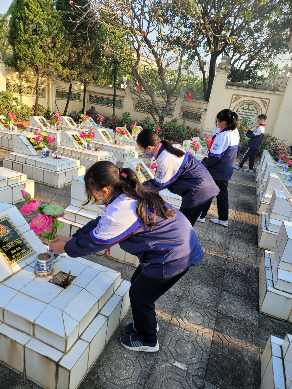 Ngay sau giờ phút dâng hương, hoa tại tượng đài, đoàn đã thắp nhang từng ngôi mộ anh hùng liệt sĩ. Những nén nhang ấm áp tình người và sự chân thành tưởng niệm đã phần nào sưởi ấm linh hồn các anh, những người con ưu tú của đất nước đã hy sinh ở giai đẹp nhất của cuộc đời.