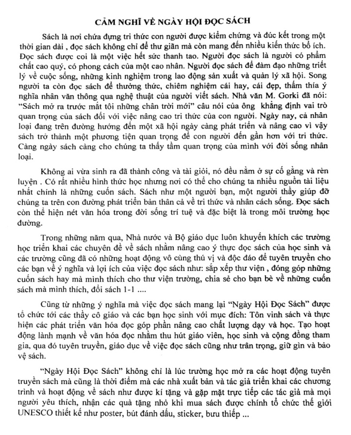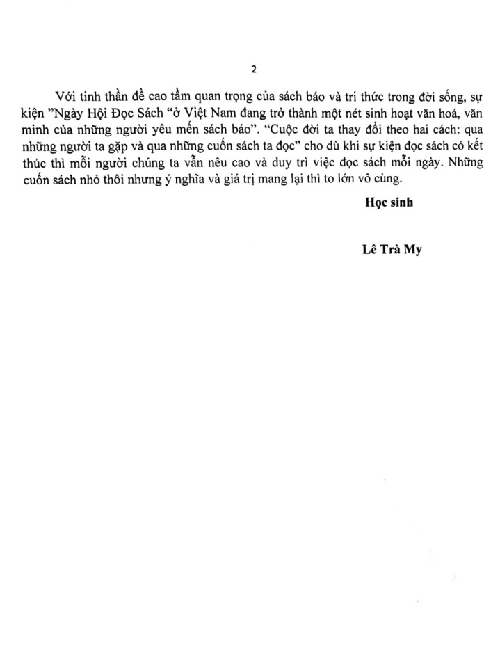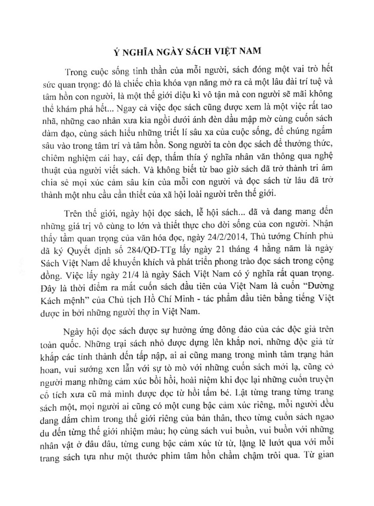 + Tổ chức viết bài cảm nhận về ngày Sách Việt Nam cho học sinh khối 8,9 (Một số bài viết tiêu biểu của học sinh) Ban Giám hiệu Trường THCS Kiến Hưng mong muốn các hoạt động phát triển văn hóa đọc trong cán bộ, giáo viên, nhân viên, học sinh sẽ được tiếp tục duy trì, tổ chức sâu rộng, góp phần nâng cao chất lượng đào tạo và nghiên cứu khoa học, đáp ứng yêu cầu đổi mới và hội nhập của Nhà trường trong thời kỳ mới.