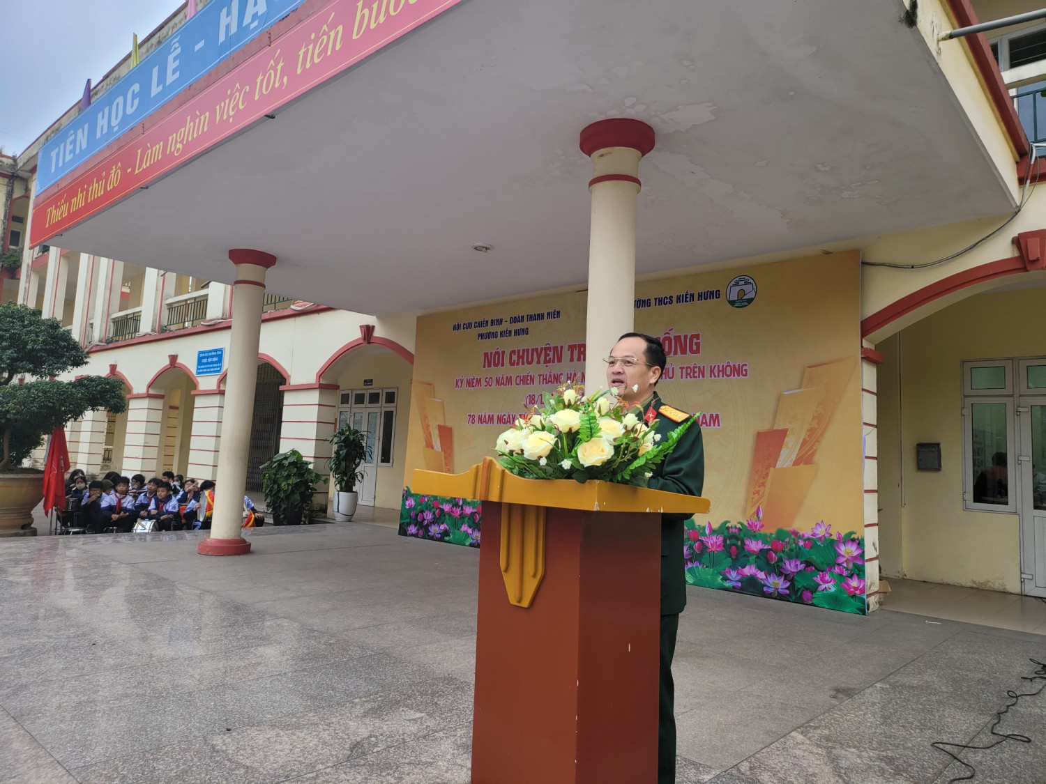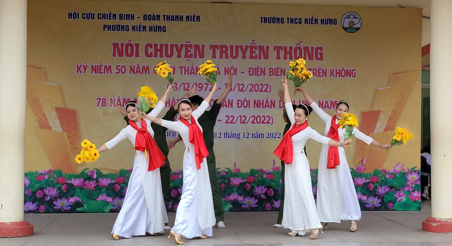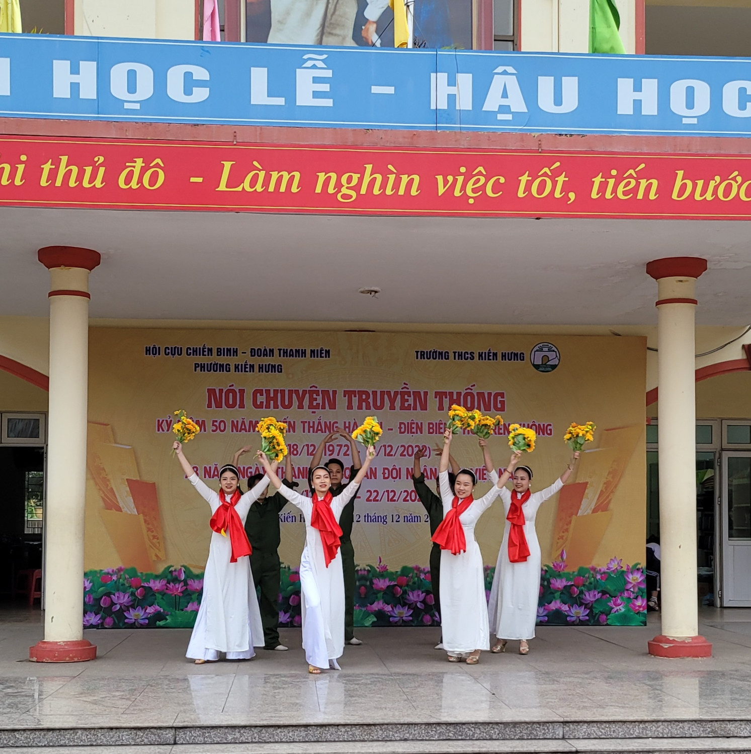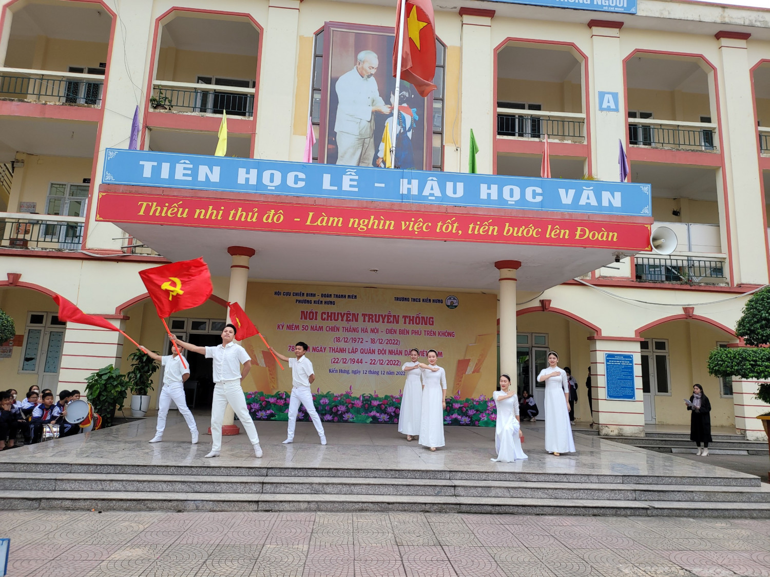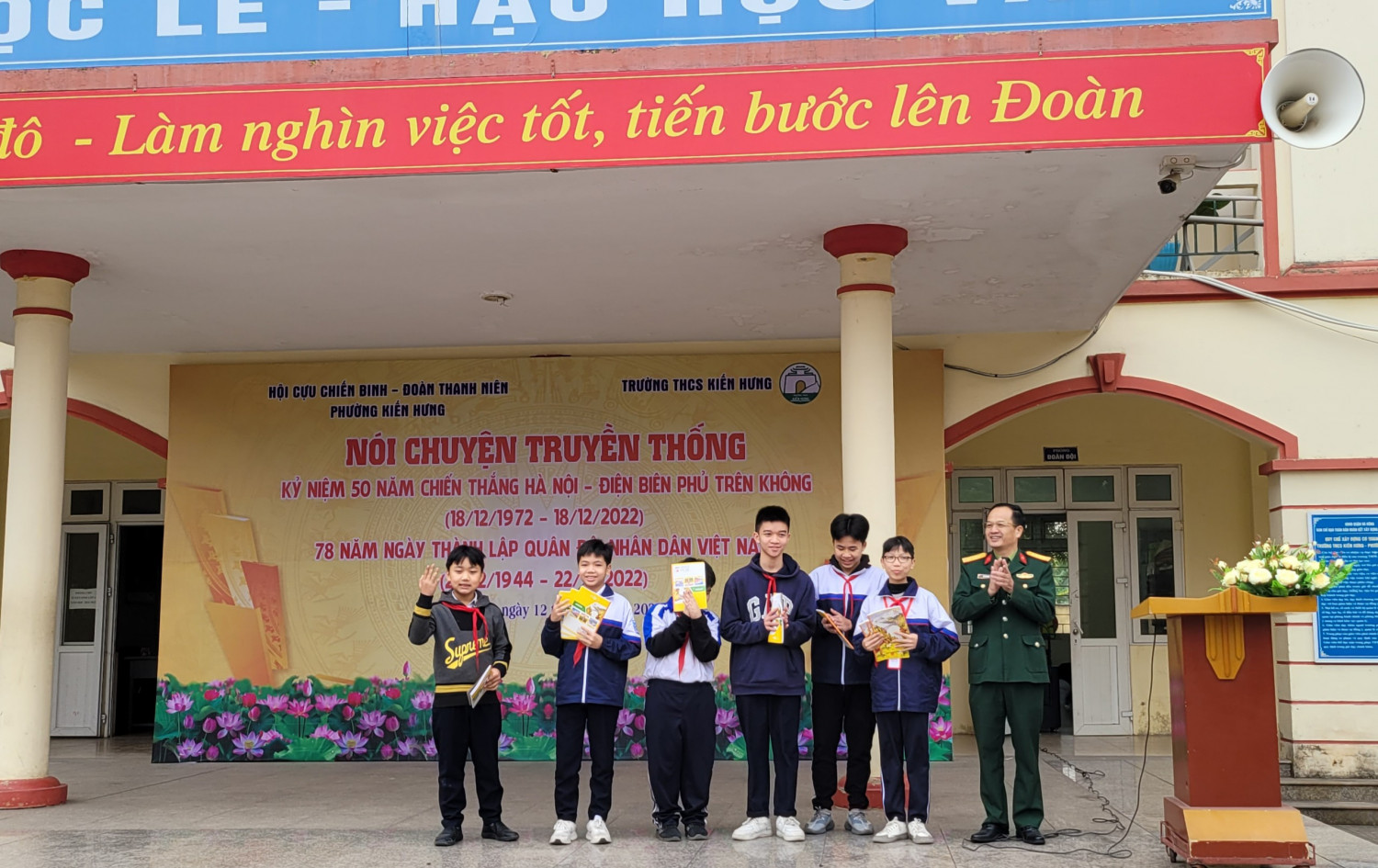 Để thiết thực chào mừng kỉ niệm những ngày lễ lớn trong lịch sử dân tộc: 50 năm chiến thắng Hà Nội - Điện Biên Phủ trên không (18/12/1972-18/12/2022), 78 năm ngày thành lập Quân đội Nhân dân Việt Nam (22/12/1944-22/12/2022); 33 năm ngày hội Quốc phòng toàn dân (22/12/1989- 22/12/2022). Sáng thứ hai, ngày 12/12/2022, Trường THCS KH phối hợp với Hội Cựu chiến binh, Đoàn thanh niên phường Kiến Hưng tổ chức chuyên đề “Nói chuyện truyền thống”.