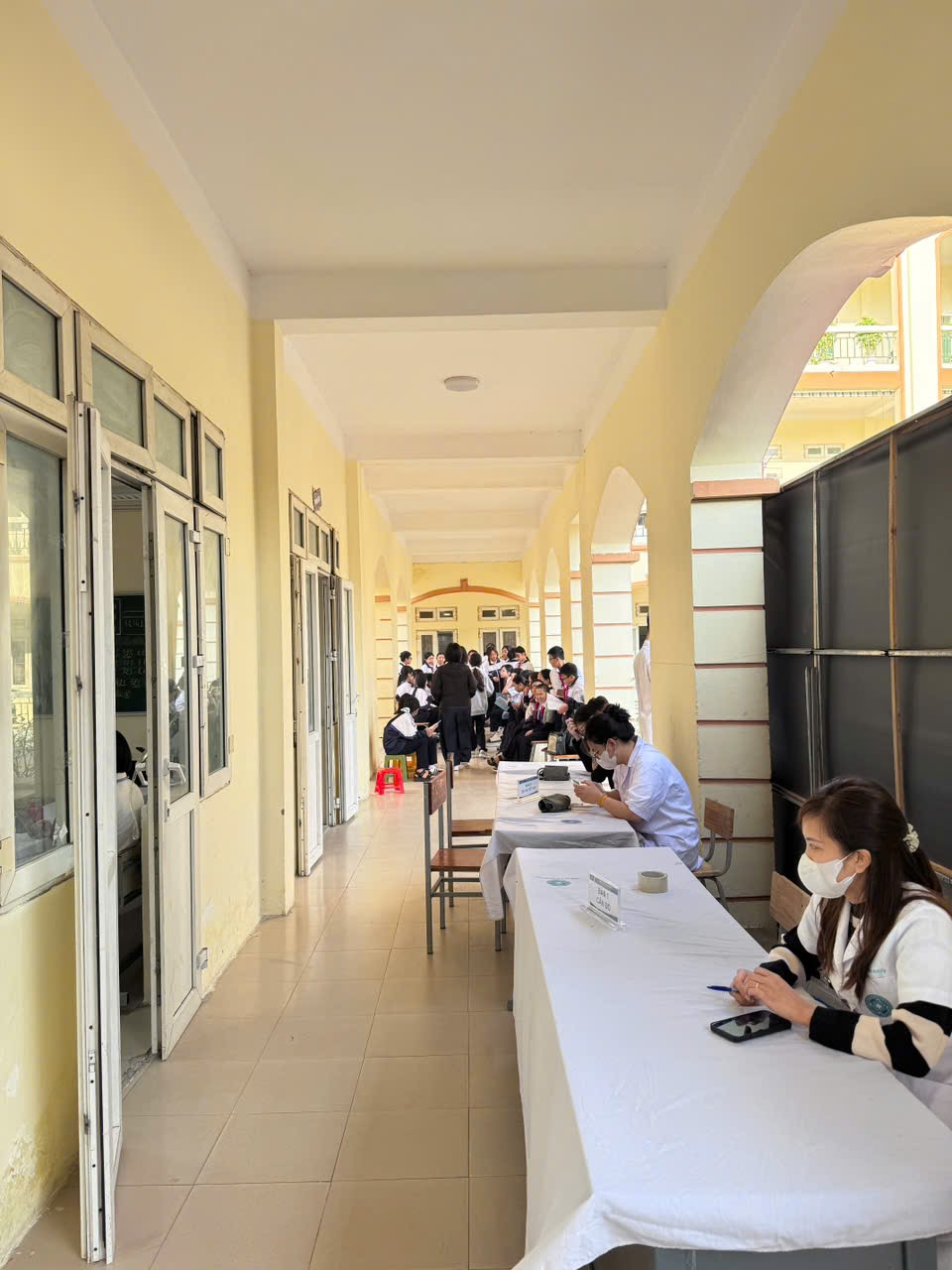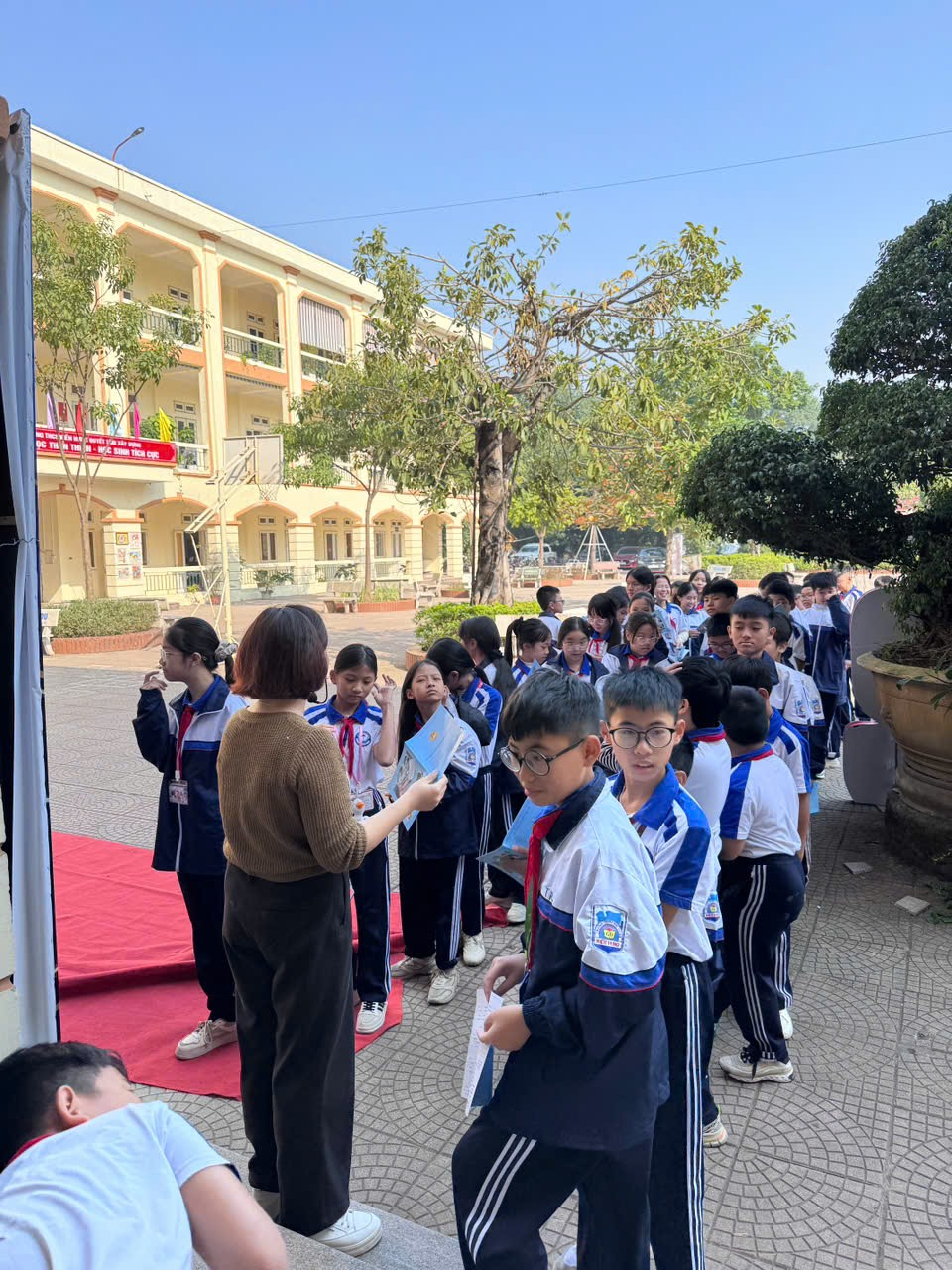 - Các bạn học sinh hào hứng xếp hàng chuẩn bị vào khám-