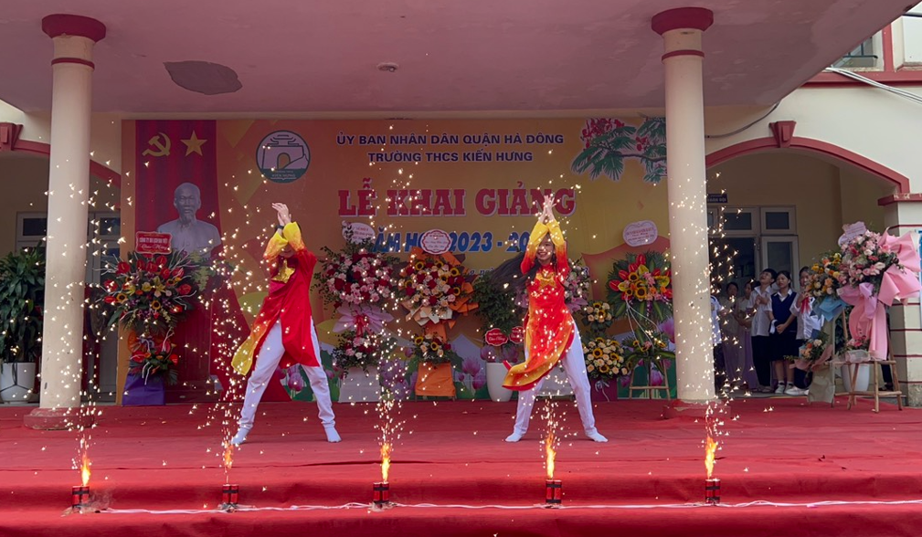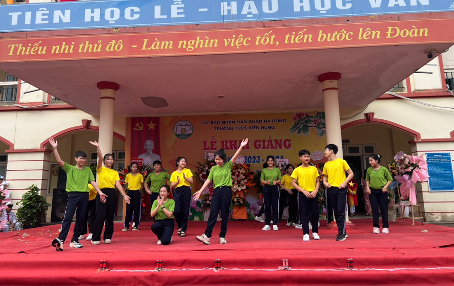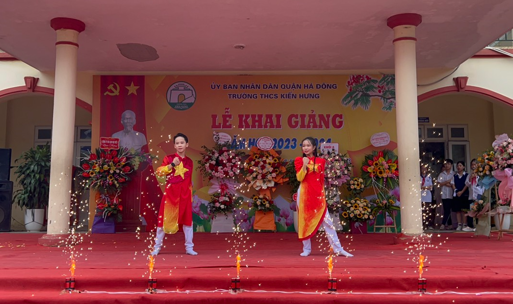 Từ 7h sáng, sân trường đã nhộn nhịp tiếng nói cười hân hoan của các em học sinh. Tiết mục trống hội tưng bừng mở đầu chương trình, các tiết mục văn nghệ đã làm bùng cháy bầu không khí của ngày hội đến trường. Bộ phim tư liệu “THCS KIẾN HƯNG – sáng tạo, bứt phá để thành công” đã thực sự chạm vào trí óc, trái tim của những người tham dự khiến chúng ta thêm hiểu, thêm yêu và tự hào về truyền thống của nhà trường. Thực hiện đúng chủ trương của Bộ Giáo dục và Đào tạo, lễ khai giảng tại trường Kiến Hưng diễn ra ngắn gọn, đảm bảo trang nghiêm, trang trọng, ấn tượng. Sau lễ chào cờ và phút sinh hoạt truyền thống đầy xúc động, cô giáo Trịnh Thị Việt Anh–Phó bí thư chi bộ, Phó hiệu trưởng nhà trường đã đọc toàn văn thư chúc mừng của chủ tịch nước Võ Văn Thưởng và đánh trống khai trường. Bức văn thư gửi gắm thông điệp quan trọng về nhiệm vụ của một năm học mới với chủ đề “Đoàn kết, kỷ cương, sáng tạo, tiếp tục đổi mới, nâng cao chất lượng giáo dục và đào tạo”. Chủ tịch nước gửi gắm kì vọng: “Một năm học mới lại bắt đầu. Đây là sự trở lại và cũng là khởi đầu cho những điều đẹp đẽ và đáng nhớ trong đời. Các em, dù ở lứa tuổi nào, cấp học nào, miền núi hay đồng bằng, biên giới hay hải đảo xa xôi… hãy luôn xác định học tập là nhiệm vụ quan trọng của cả cuộc đời”.
